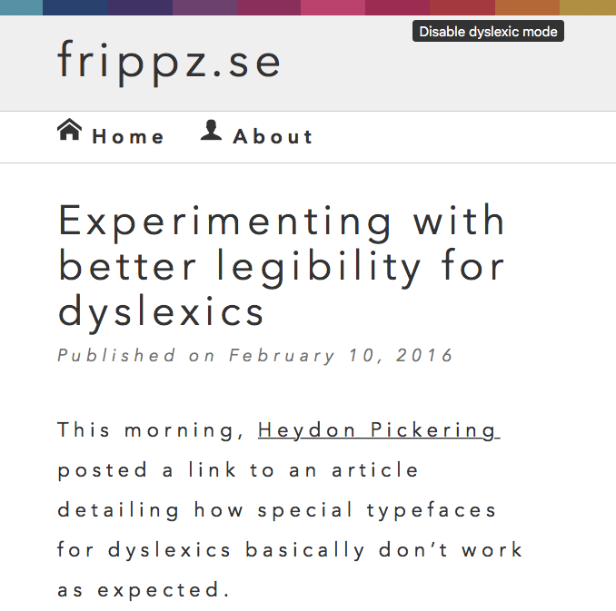 JavaScript certainly isn’t my strongest skill, but I manage to get by. All we need to do in order to toggle our dyslexics mode is to toggle the modifier class on the <body>. To get a little progressive enhancement into the mix, I also added the toggle button with JavaScript. This of course means that if JavaScript is not available to the user, they can’t toggle the dyslexics mode. Then again, we won’t have a silly button in the banner region that does nothing.